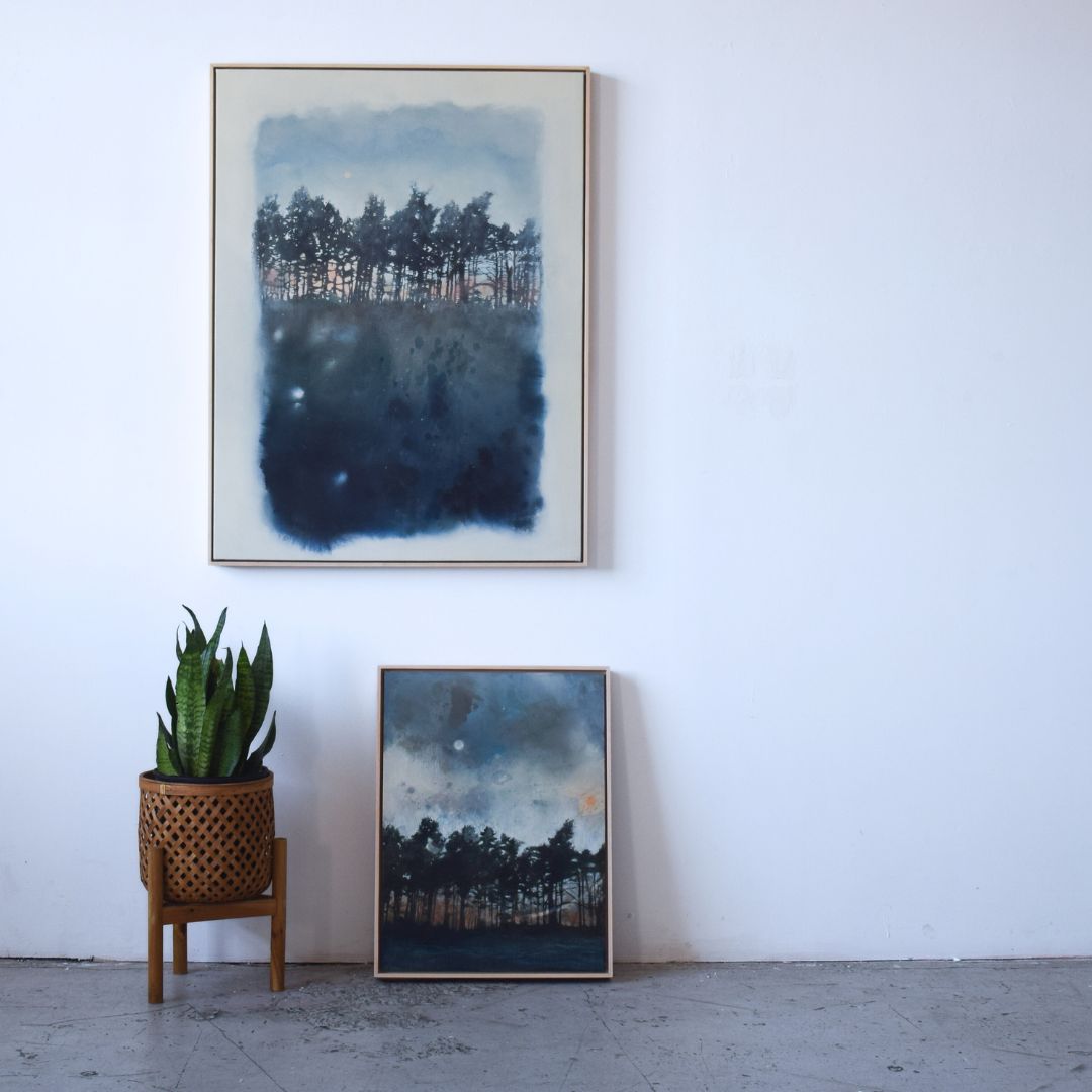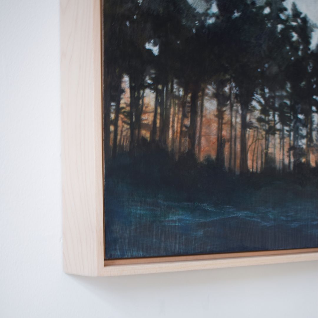 Painting come framed, wired, and ready for hanging. Includes a 2.5-inch-deep, raw maple, floater frame that is handcrafted by a carpenter.