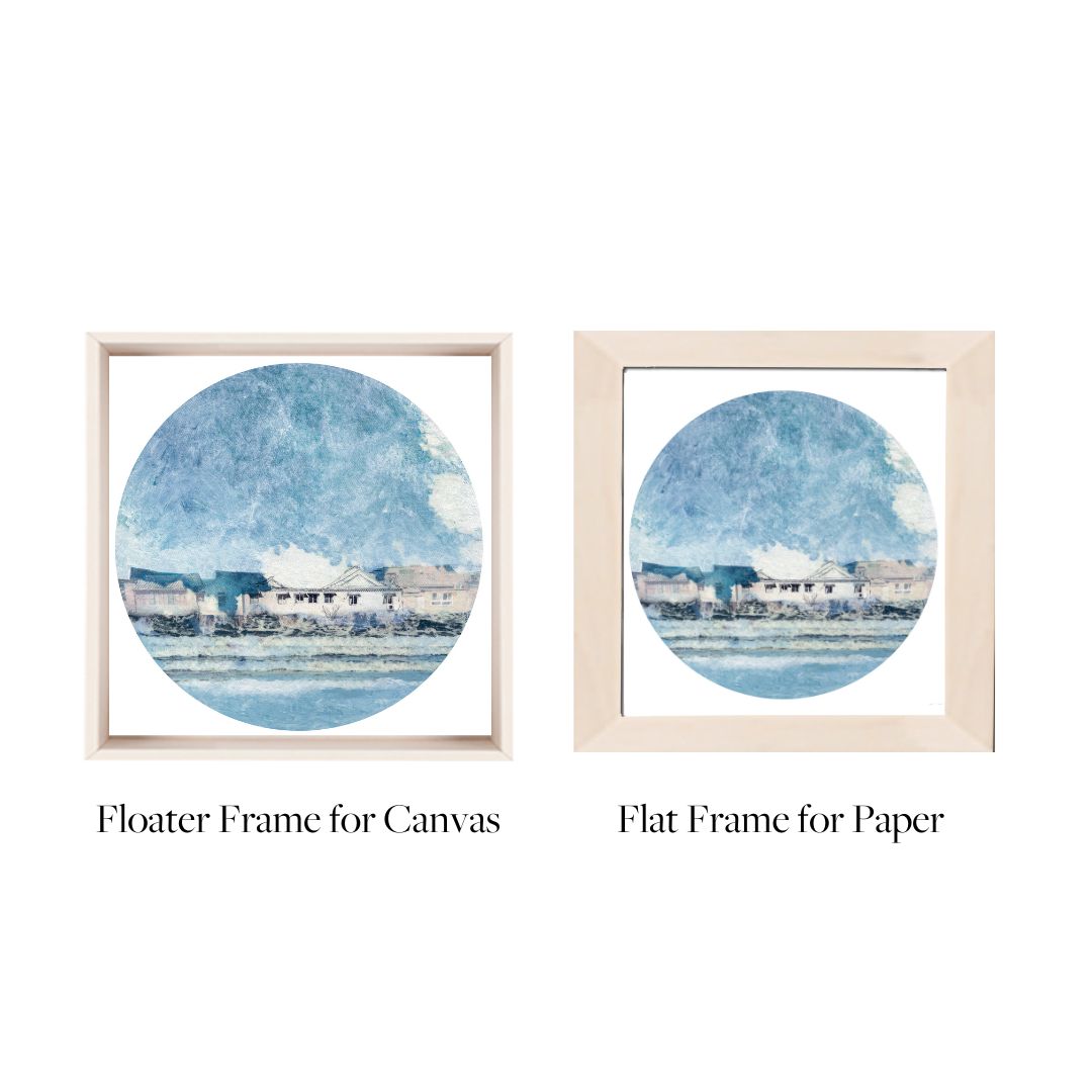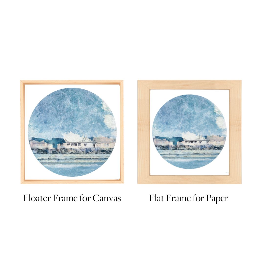 Choose a flat frame with professional quality acrylic glass and complimentary dry mounting for a paper print. Stretched canvas prints come with a protective varnish and are framed in a floater frame.