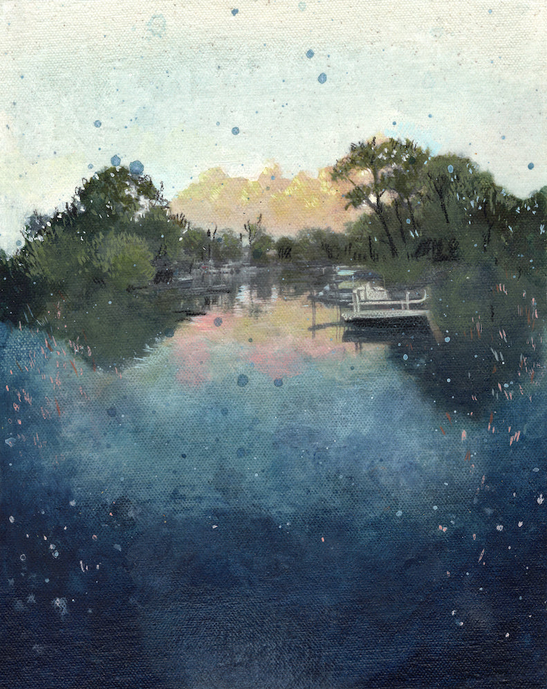 The painting Spring Harbor explores the profound connections between our surroundings and inner landscapes through the act of walking near water. Stephanie often goes for daily walks near water as a part of her creative practice and as a way to ground herself. Through her art, she hopes to share that same sense of relief and calm with the viewer.