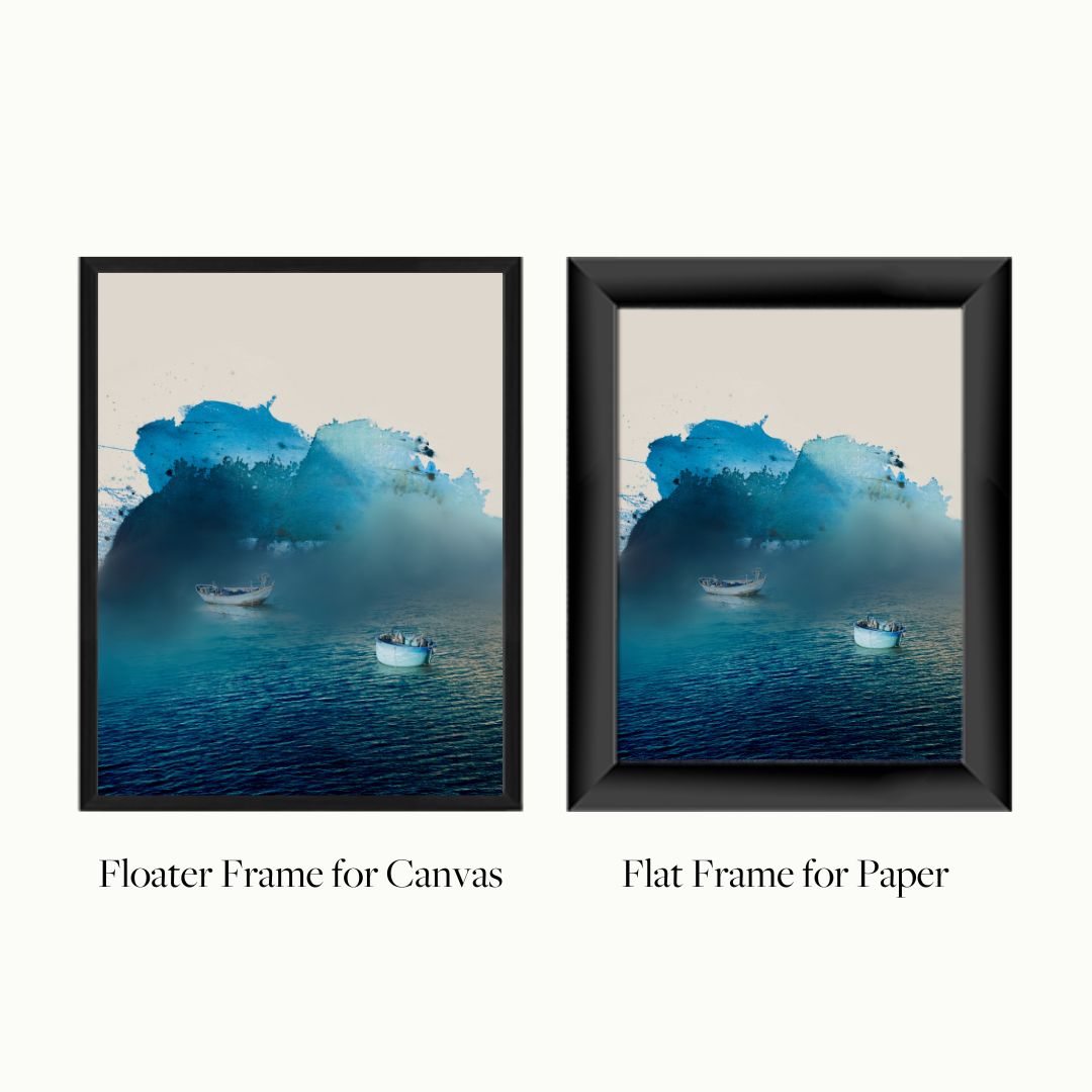 Choose a flat frame with professional quality acrylic glass and complimentary dry mounting for a paper print. Stretched canvas prints come with a protective varnish and are framed in a floater frame.