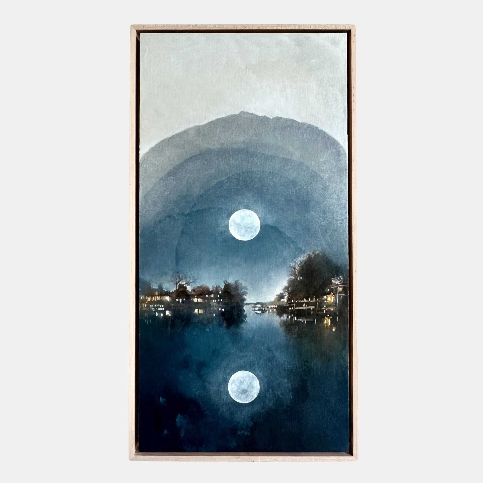 Painting come framed, wired, and ready for hanging. Includes a 2.5-inch-deep, raw maple, floater frame that is handcrafted by a carpenter.