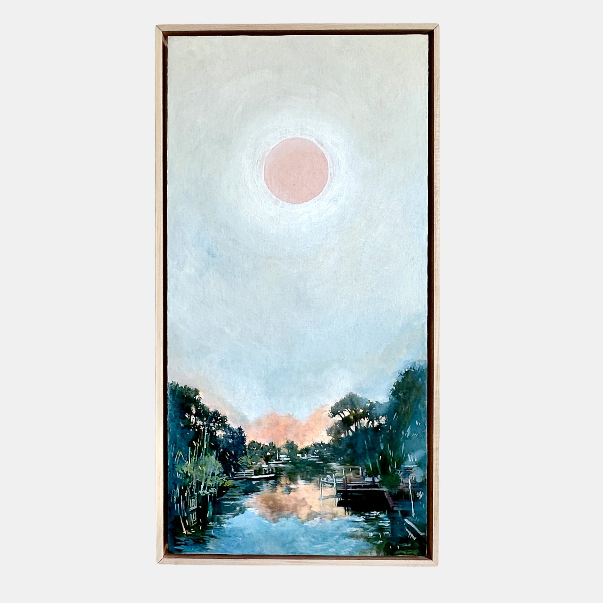 Painting come framed, wired, and ready for hanging. Includes a 2.5-inch-deep, raw maple, floater frame that is handcrafted by a carpenter.
