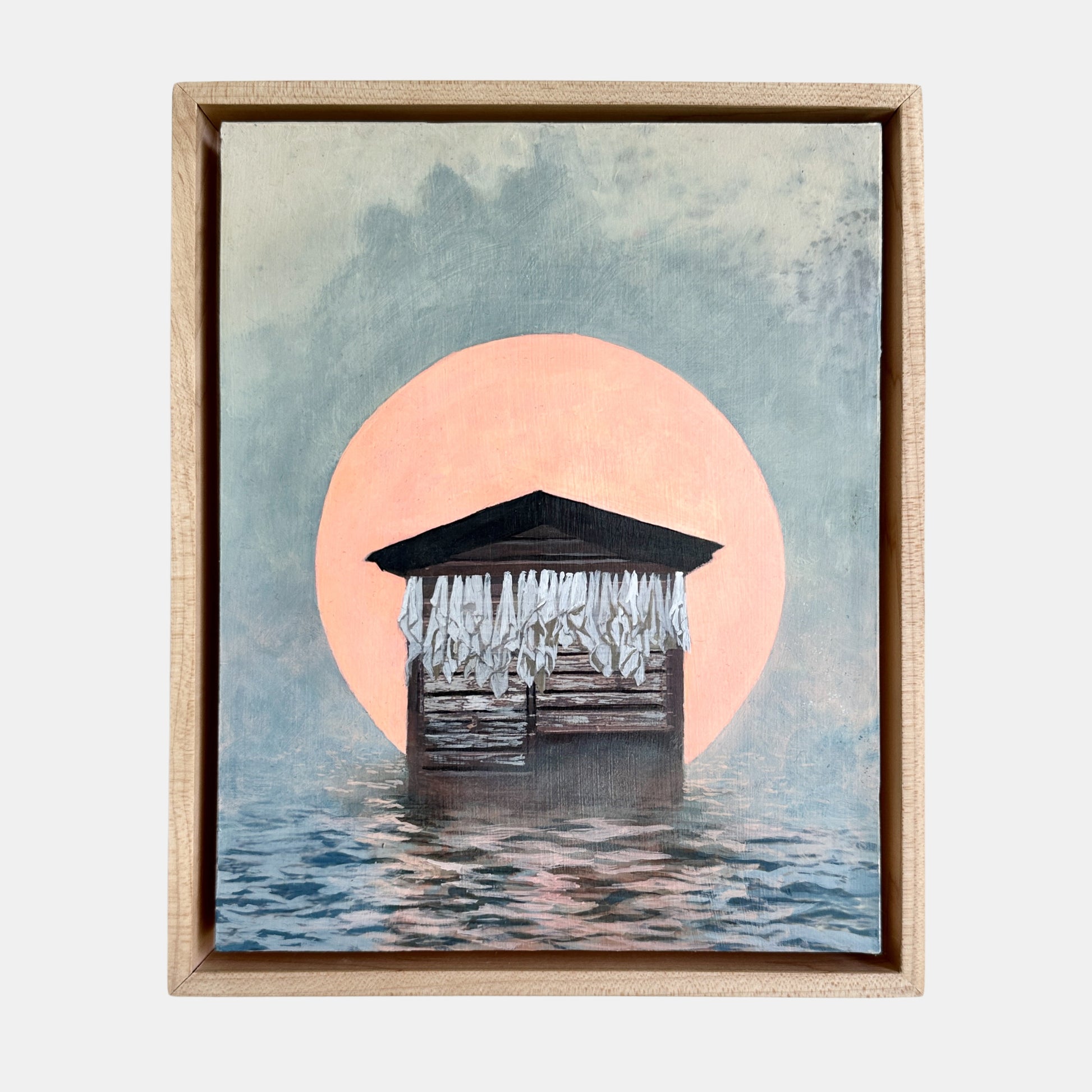 Painting come framed, wired, and ready for hanging. Includes a 2.5-inch-deep, raw maple, floater frame that is handcrafted by a carpenter.